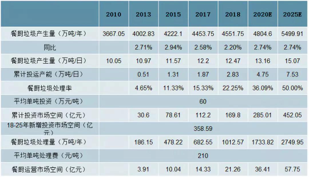 至2025年廚余垃圾投資市場超千億、運營市場空間可達146億。2017年全國地級及以上城市生活垃圾清運量為1.76億噸/年,為全國城市垃圾清運量的81.97%。采用中國再生資源回收利用協會數據,假設廚余垃圾占生活垃圾的比重為56%,則估計全國地級及以上城市廚余垃圾清運量為27.07萬噸/日。
