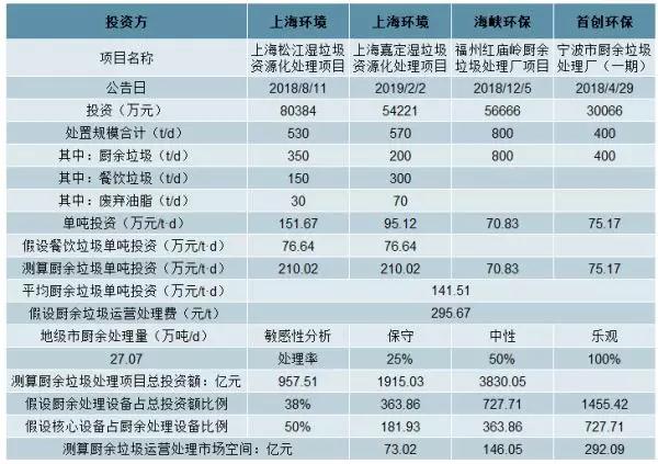 以100個餐廚垃圾試點城市的平均餐廚垃圾項目單噸投資額76.6萬元/t,處理費197元/t作為合理估計值,可得上海環境松江、上海環境嘉定、海峽環保福州、首創環保寧波(一期)4個項目的平均廚余垃圾單噸投資額為141.5(萬元/t)。考慮到廚余垃圾的綜合處理費較高,假設廚余垃圾處理費是餐廚垃圾的1.5倍為295.7(元//t•d),以地級及以上城市平均每天產生約27萬噸廚余垃圾測算,在中性情景下(即垃圾分類完成率為50%),廚余垃圾總投資額市場空間為1915億;按廚余垃圾處理設備占總投資額的38%,核心設備占廚余處理設備的50%計算,對應市場空間為364億;2025年廚余垃圾運營處理市場的空間預計可達146億元,市場空間廣闊。